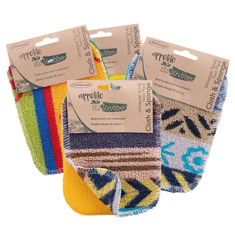 Appetito "Eco Scrubber" Universal Scrub Twin Pack Cloth and Sponge 12 x 16.5cm - 4 Assorted Designs/Colours