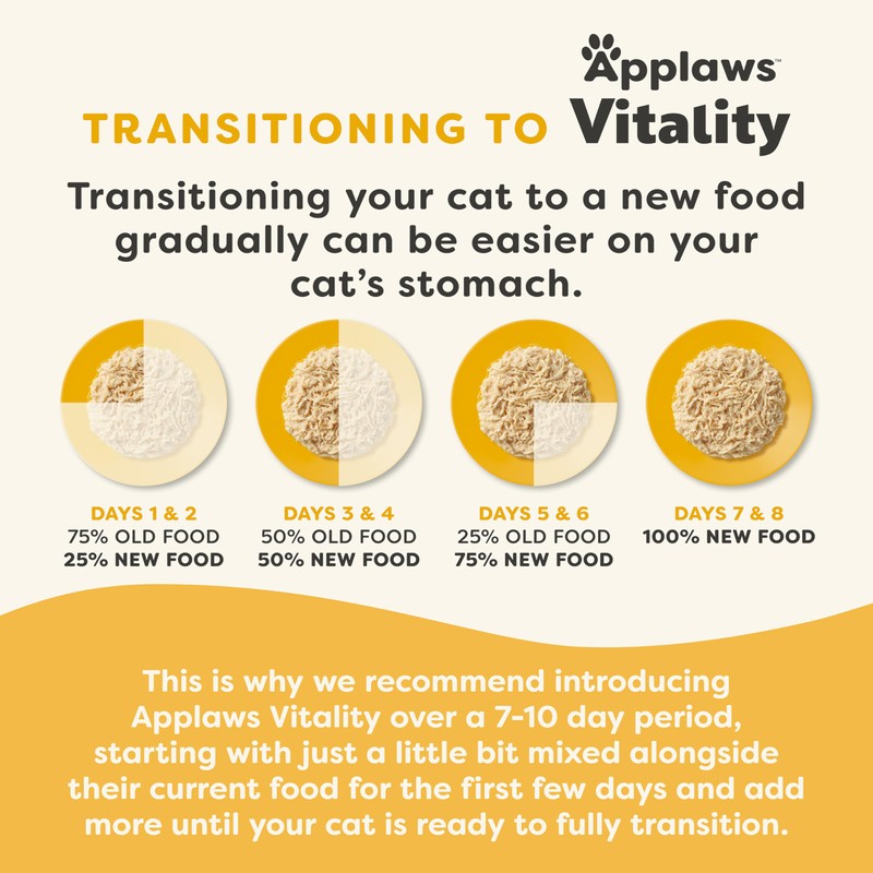 - Naturally Tasty Goodness for Cats: Applaws Vitality is made with natural ingredients and enriched with added vitamins and minerals to support your cat's overall health and well-being. This high-quality canned cat food delivers a delicious, nutritious meal your cat will love. As with any new food, we recommend gradually introducing Applaws Vitality to make switching easier on your cat’s stomach.