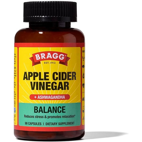 Est. 1912 Balance Reduces Stress & Promotes Relaxation Dietary Supplement Kosher Non GMO Project Verified High Purity Ashwagandha No Artificial Colors or Flavors Vegan Daily Dose of Ashwagandha ACV Balance is made with Bragg® Apple Cider Vinegar plus Sensoril® Ashwagandha, which supports the body's natural ability to manage temporary stress. Together, these ingredients work to reduce cortisol and balance energy levels so you feel calm, relaxed and centered. 750 mg of Acetic Acid (The Good Stuff) Each daily serving of three capsules provides 750 mg of The Good Stuff-the same amount as one tablespoon of liquid ACV - which has been clinically shown to maintain healthy weight, cholesterol, and blood sugar levels. Maintains Healthy: Cortisol Levels Weight Levels Blood Glucose Levels Cholesterol Levels