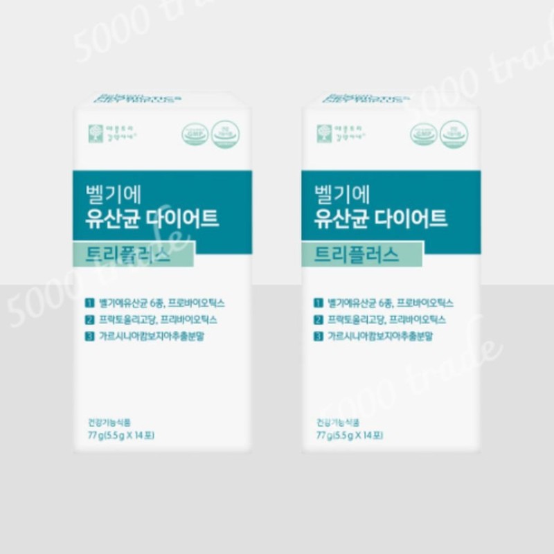 제품명 벨기에 유산균 다이어트 트리플러스제조업소의 명칭과 소재지 ㈜메디오젠 충주공장 / 충청북도 충주시 대소원면 메가폴리스 3로 17소비기한 및 보관방법 수시 제조되는 상품으로 매번 생산일이 상이하여 정확한 표기가 어렵습니다. Q&A 또는 고객센터로 문의주시면 안내 도와드리겠습니다.포장단위별 내용물의 용량(중량), 수량 5.5g x 14포 1박스원료명 및 함량 프락토올리고당, 가르시니아캄보지아추출물(인도산), 유산균혼합분말{Lactobacillus plantarum, Lactobacillus rhamnosus, Bifidobacterium longum, Lactobacillus gasseri, Lactobacillus acidophilus, Bifidobacterium bifidum, 말토덱스트린), 폴리덱스트로스(포도당, D-소비톨, 인산), 레몬과즙분말(미국산), 자일리톨, 말토덱스트린, L-프롤린, 효소처리스테비아, 레몬밤분말(프랑스산), 비타민미네랄혼합제제[제이인산칼슘, 산화마그네슘, 비타민C, 분말비타민B12(말토덱스트린, 구연산삼나트륨, 구연산, 비타민B12), 니코틴산아미드, 환원철, 산화아연, 분말비타민D3(아라비아검, 자당, 옥수수전분, 가공유지, 이산화규소, 비타민D3, 비타민E), 비타민B6염산염, 비타민B1염산염, 비타민B2, 분말비타민A아세테이트(포도당시럽분말, 아라비아검, 옥수수전분, 비타민A아세테이트, 비타민E), 분말비타민E(dl-a-tocopheryl acetate, 변성전분, 포도당시럽분말, 이산화규소), 말토덱스트린, 엽산] 우유, 함유영양정보 1일 섭취량 : 1포(5.5g) 열량 20Kcal, 탄수화물 5g(2%), 단백질 0g(0%), 지방 0g(0%), 나트륨 10mg(1%), 프로바이오틱스 100,000,000CFU, 프락토올리고당 3g, HCA 750mg ※ %영양성분기준치: 1일 영양성분기준치에 대한 비율기능정보 [프로바이오틱스] 유산균 증식 및 유해균 억제. 배변활동 원활, 장건강에 도움을 줄 수 있음. [프락토올리고당] 장내 유익균 증식 및 배변활동 원활에 도움을 줄 수 있음. [가르시니아캄보지아추출물] 탄수화물이 지방으로 합성되는 것을 억제하여 체지방 감소에 도움을 줄 수 있음.섭취 시 주의사항 및 부작용 발생 가능성 1일 1회, 1회 1포를 직접 섭취하거나 물과 함께 섭취하십시오. 1. 질환이 있거나 의약품 복용 시 전문가와 상담하십시오. 2. 특이체질, 알레르기 체질 등은 개인에 따라 과민반응을 나타낼 수 있으므로 전문가와 상담 후 섭취여부를 결정하십시오. 3. 어린이가 함부로 섭취하지 않도록 일일섭취량 방법을 지도하시기 바랍니다. 4. 이상사례 발생 시 섭취를 중단하고 전문가와 상담하시기 바랍니다. 5. 어린이, 임산부 및 수유부는 섭취를 피하기 바랍니다. 6. 간, 심장, 신장질환, 알레르기 및 천식이 있거나 의약품 복용 시 전문가와 상담 후 섭취여부를 결정하십시오. 7. 섭취 시 가스참, 트림, 복통, 복부 팽만감 등이 발생할 수 있습니다.의약외품 표현 본제품은 질병의 예방 및 치료를 위한 의약품이 아닙니다.소비자안전을 위한 주의사항 ※ 본 제품은 알류(가금류), 대두, 메밀, 땅콩, 잣, 밀, 고등어, 게, 새우, 돼지고기, 복숭아, 토마토, 호두, 닭고기, 쇠고기, 오징어, 조개류(굴, 전복, 홍합 포함)를 사용한 제품과 같은 제조시설에서 제조하고 있습니다.유전자변형건강기능식품 해당 여부 해당없음수입신고 필 문구 해당없음