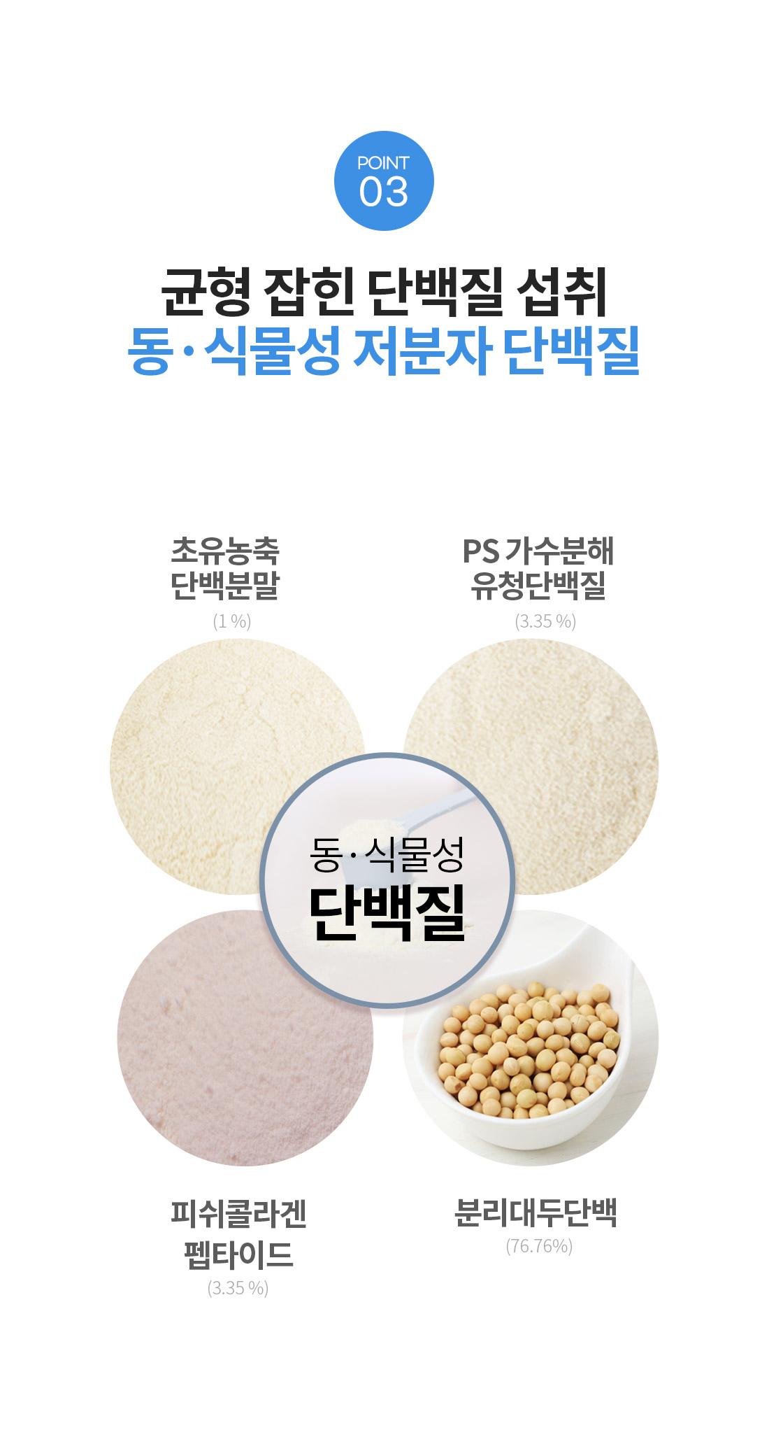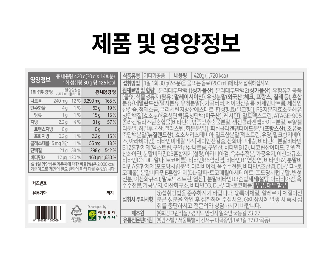 - 원(재)료명 및 함량: 분리대두단백1(싱가포르산), 분리대두단백2(싱가포르산), 유함유가공품[물엿, 식물성유지(팜유:말레이시아산), 유청분말(외국산:체코, 프랑스, 칠레 등), 혼합분유{네덜란드산(탈지분유, 유청분말)}, 가공버터, 제이인산칼륨, 카제인나트륨, 제삼인산칼슘, 정제소금, 글리세린지방산에스테르, 합성향료(밀크향)], PS저분자효소분해유청단백질[효소분해유청단백{유청단백(미국산), 레시틴}, 말토덱스트린, ATAGE-905콜라겐엘라스틴혼합물(비타민C, 병풀잎추출물분말, 생선콜라겐펩타이드분말, 로얄젤리분말, 히알루론산, 엘라스틴, 화분분말)], 피쉬콜라겐펩타이드분말(프랑스산), 초유농축단백분말(뉴질랜드산), 효소처리스테비아, 밀크향분말(덱스트린, 유당, 밀크향키베이스, 아라비아검), 비타민미네랄믹스[제이인산칼슘, 산화마그네슘, 비타민C, 분말비타민B12혼합제제(덱스트린, 구연산삼나트륨, 구연산, 비타민B12), 니코틴산아미드, 환원철, 산화아연, 분말비타민D3혼합제제(설탕, 아라비아검, 옥수수전분, 가공유지, 이산화규소, 비타민D3, DL-알파-토코페롤), 비타민B6염산염, 비타민B1염산염, 비타민B2, 분말비타민A혼합제제(포도당시럽분말, 아라비아검, 옥수수전분, 비타민A초산염, DL-알파-토코페롤), 분말비타민E혼합제제(DL-알파-토코페릴아세테이트, 포도당시럽분말, 변성전분, 이산화규소), 말토덱스트린, 엽산], 분말비타민D3혼합제제(설탕, 아라비아검, 옥수수전분, 가공유지, 이산화규소, 비타민D3, DL-알파-토코페롤) 우유, 대두 함유