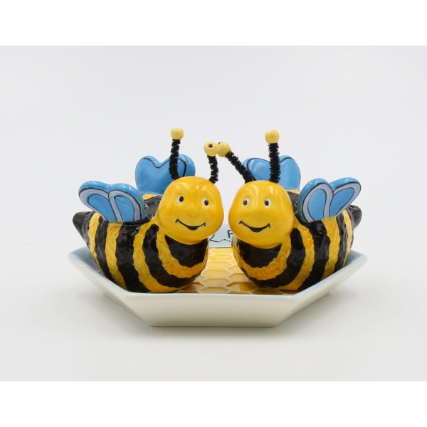 Appletree 2-Inch Ceramic Bee Salt and Pepper with Honeycombed Tray, Yellow