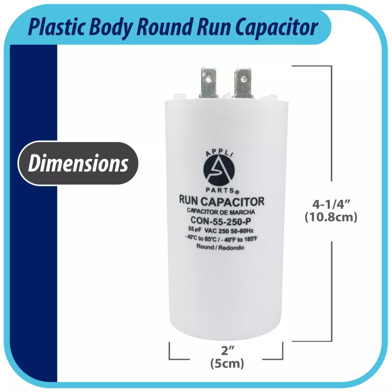 Appli Parts Run Capacitor for electric motors 55 Mfd uF (microfarads) 250VAC Pla