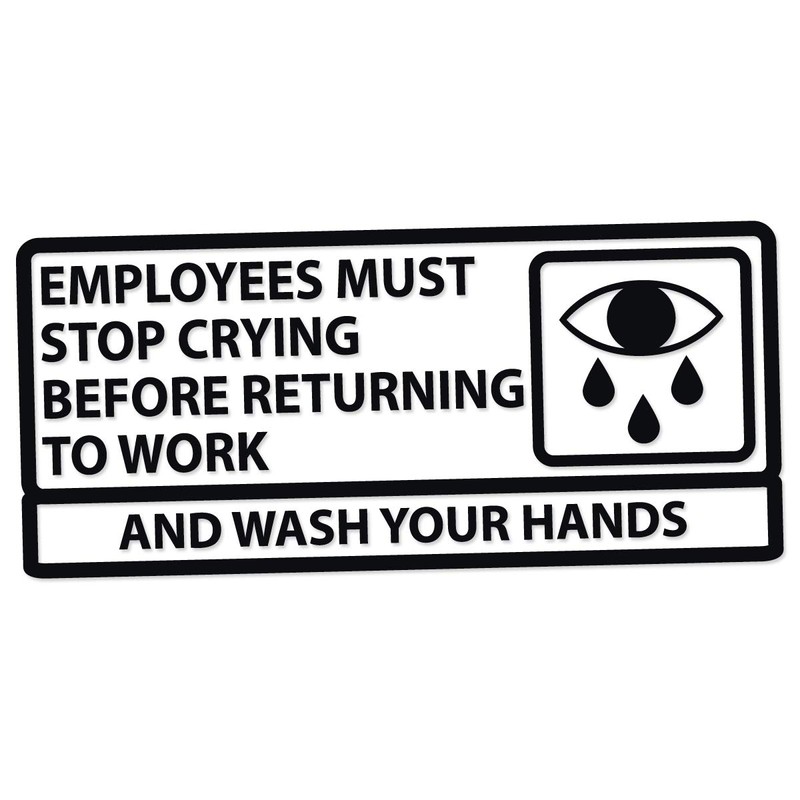 Applicable Pun Employees Must Stop Crying Before Returning to Work Wash Your Hands - Vinyl Decal - Black 7 Inches Wide