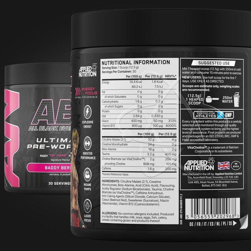 Applied Nutrition ABE Pre Workout - All Black Everything Pre Workout Powder, Energy & Physical Performance with Citrulline, Creatine, Beta Alanine (375g - 30 Servings) (Baddy Berry)