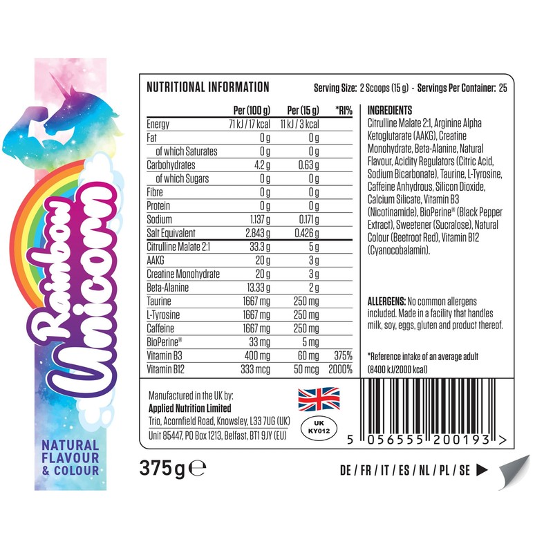 Applied Nutrition Applied Nutrition Pump 3G Pre Workout - Energy, Focus & Performance (375g - 25 Servings) (Rainbow Unicorn)