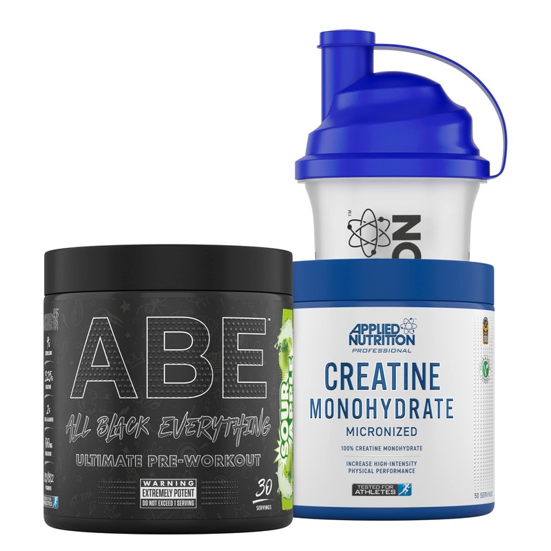 Applied Nutrition Bundle ABE Pre Workout 375g + Creatine 250g + 700ml Protein Shaker | All Black Everything Pre Workout Powder, Energy & Performance with Creatine, Beta Alanine (Sour Apple)