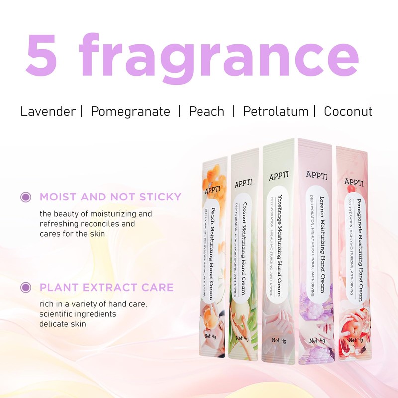 - Pack of 10 packs of 4 g APPTI Healing Hand Cream with different fragrances (original flavour, lavender, peach, coconut, pomegranate)