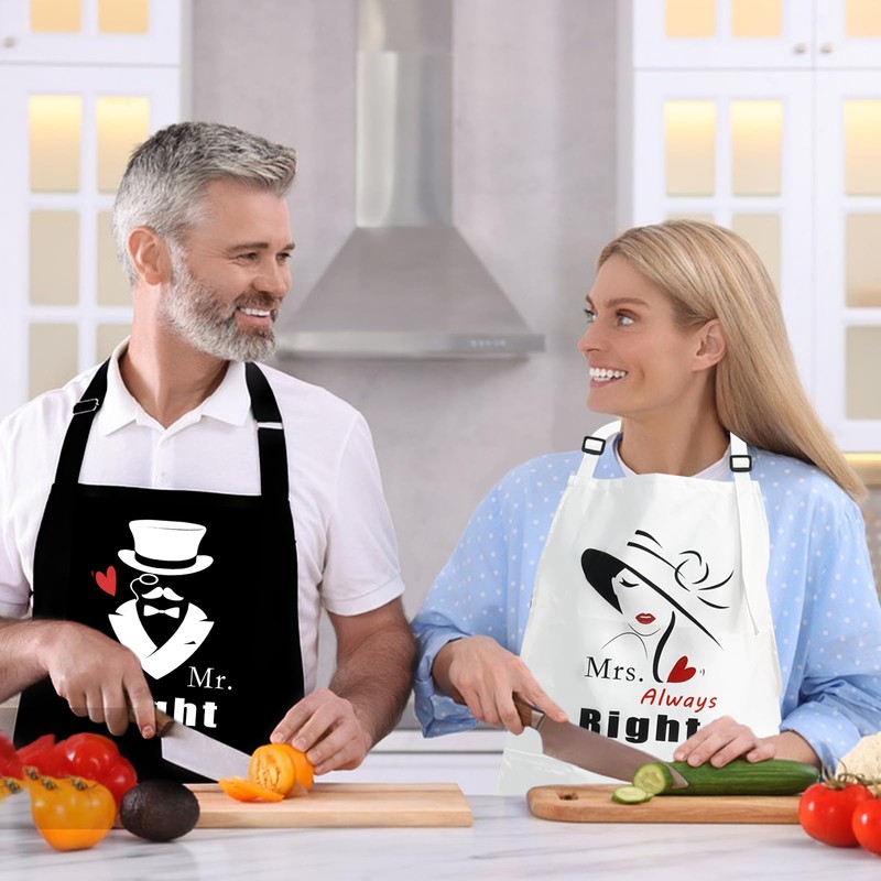 • Humour in the kitchen: the pair of apron presents the themes 'Mr. Right' and 'Mrs. Always Right' in a humorous way, which not only adds interest, but also provokes sweet interactions between husband and wife. Mr. Right' and "Mrs. Always Right" not only add interest, but also stimulate sweet interactions between husband and wife. The simple black and white design is suitable for everyday use or as a gift for special occasions.
