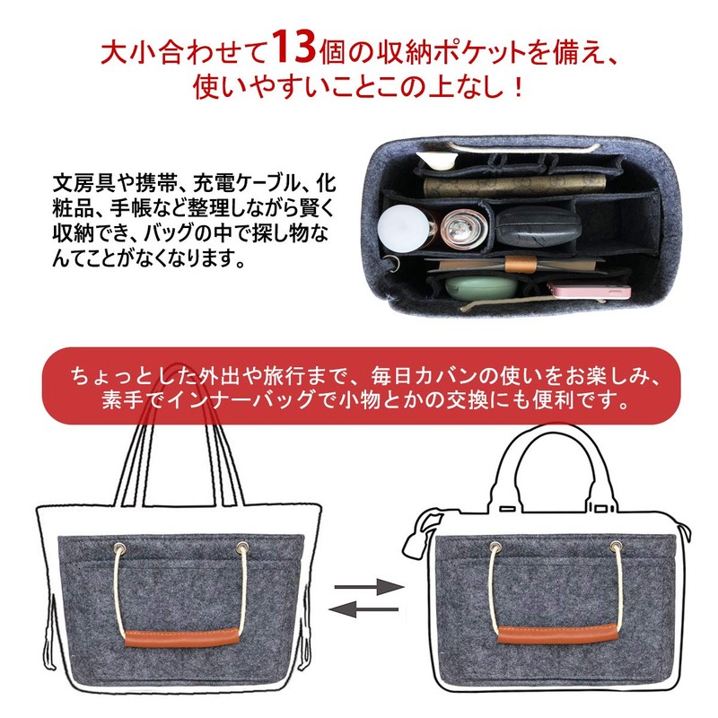 [APSOONSELL] Bag-in-back Lightweight Felt Freestanding Cosmetic Pouch Included Bag in Bag Organizer Insert Bag Tote Bag in Bag L Gray, gray