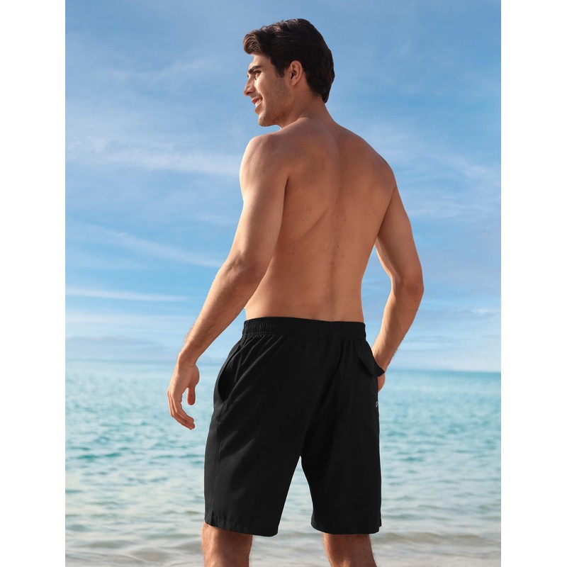 - Feature: These 9" inseam swimwear beach shorts are knee length and relax fit; Elastic waistband with adjustable drawstring allows the shorts to fit comfortably; The stitches are neat and close be the same outside and inside; Machine washable