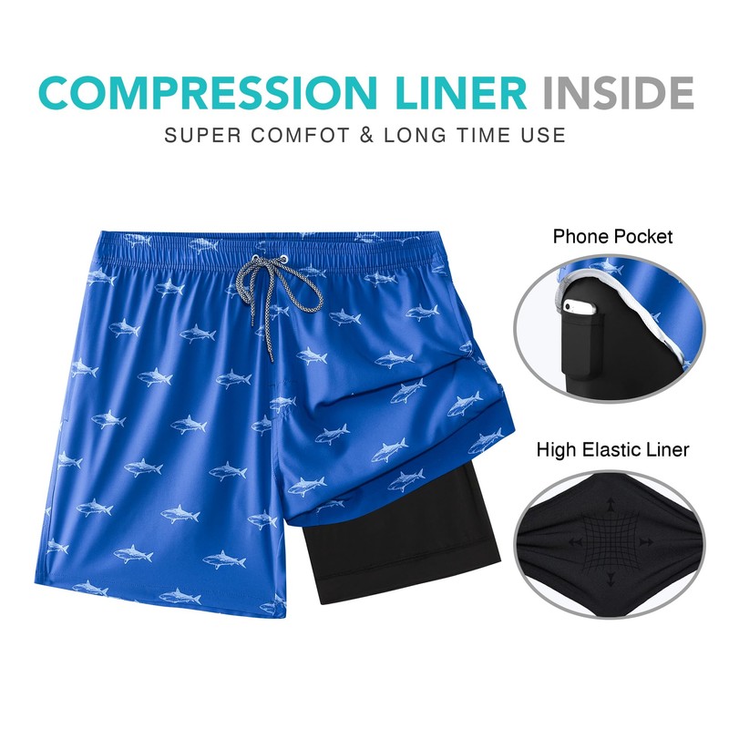 - Swim trunks and compression liner 2 in 1 Design: Comfortable and soft, fitting without tightness, while avoiding the impact of friction or sands, better protecting private parts, more suitable for beaches and swimming pools