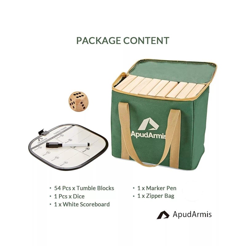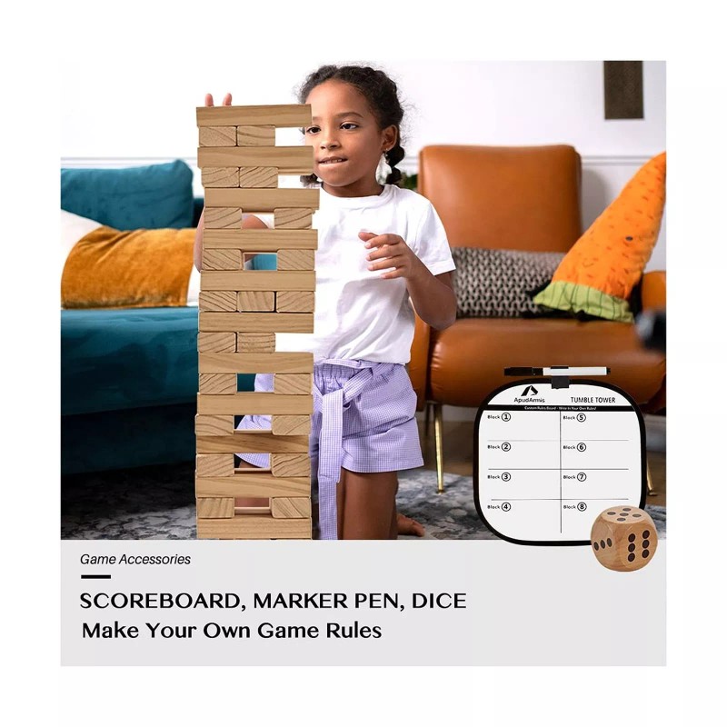 - 54 Pieces Giant Timber GameThe Classic Tumble Tower Set comes with 54 pieces Tumble Blocks, 1 pcs Dice, 1 pcs White Scoreboard, 1 pcs Marker Pen and a Zipper bag. Each crafted wood stack measures 4.75*1.6*1 In. The Stacking Games bring everyone challenge and fun, starting out at 1.5 FT (18 rows) tall and can be grown up to 3 FT tall tower when played.