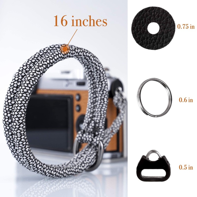 • VERSATILITY: Camera wrist strap is hand-woven from Para-cord, 16 inches long, and weighs 1.6 ounces with 2 optional triangular ring connector (More Stable) and circle ring connector (More convenient) and round protective leather mat. Quick-release of the stainless steel metal ring can flexibly adjust the tightness and ensure camera safety.