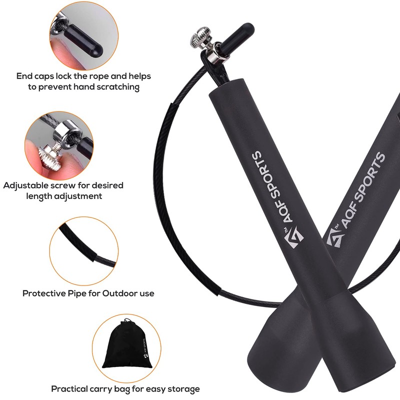 • Why AQF Speed Rope: Increase the heart rate, burn calories, enhance coordination with our super-lightweight plastic handle dual ball bearing PVC coated steel wire skipping jump rope. Smooth, near frictionless motion. Ideal for cross fit, multiple double under and competitive speed jumping.