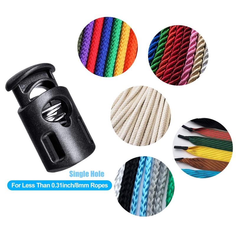 - 【Cord Lock Dimension】: 1.06 x 0.59inch/27x15mm(Length * Width), Hole diameter: 0.31inch/8mm; Color: Black; Package Content: 10pcs x single hole cord locks