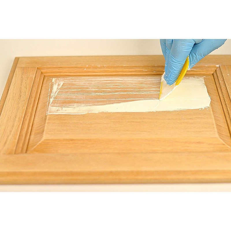 - EASY TO USE- Work the White Cabinet Grain Filler generously into open wood grain and pores against the grain with a small squeegee, bond blade, old credit card, or fingers with a glove. Scrape off excess with a squeegee, bondo blade, or an old credit card with the grain. Let dry 45-60 minutes. VERY lightly sand with a 320 or higher grit sandpaper or a fine scotchbrite sanding pad immediately before your next application of grain filler or your first coat of primer and paint.