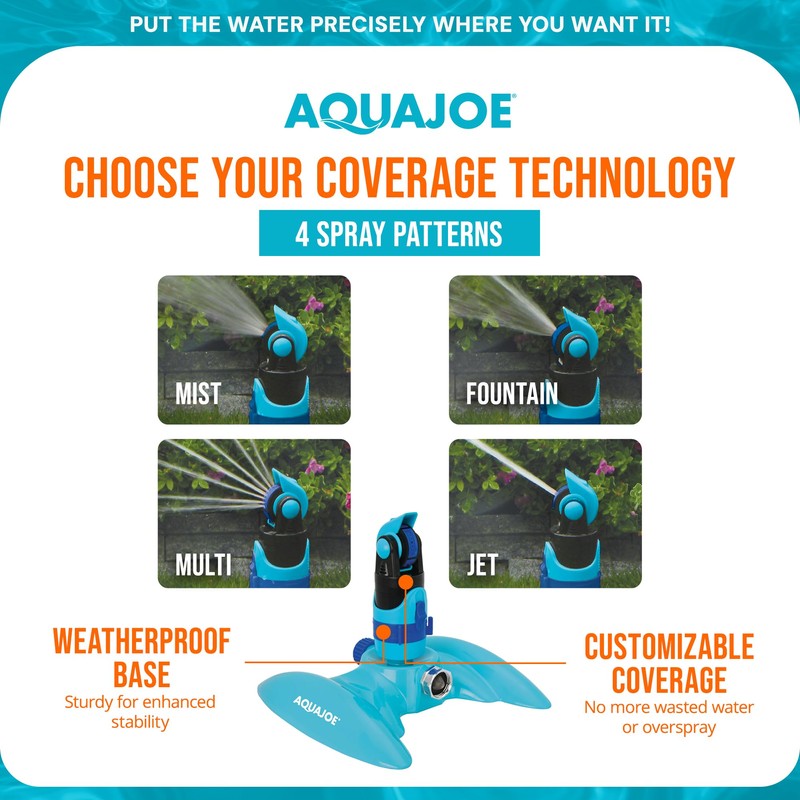 PUT THE WATER PRECISELY WHERE YOU WANT IT! No more wasted water or overspray - keep your grass green and lawn lush with the AJ-MSSBM 4-Pattern Turbo Drive 360º Sprinkler from AQUA JOE. With AQUA JOE’s completely customizable coverage`, you’ll have the control you need to make your yard the envy of the entire neighborhood. Water your way with just a twist of the 4 selectable spray patterns: mist, fountain, multi or jet, powered by AQUA JOE’s turbo drive motor for quiet, dependable operation, season after season. Then, slide the tabs to set your range, adjust the desired distance, coverage and rotation — up to 3740 sq ft, ideal for most lots, lawns and gardens. A sturdy weatherproof base provides enhanced stability and durability for outdoor use, plus AQUA JOE’s durable, zinc fittings provide a secure, leak-proof connection to a standard garden hose. When it comes to watering with customizable control, go with the flow — and Go With Joe!