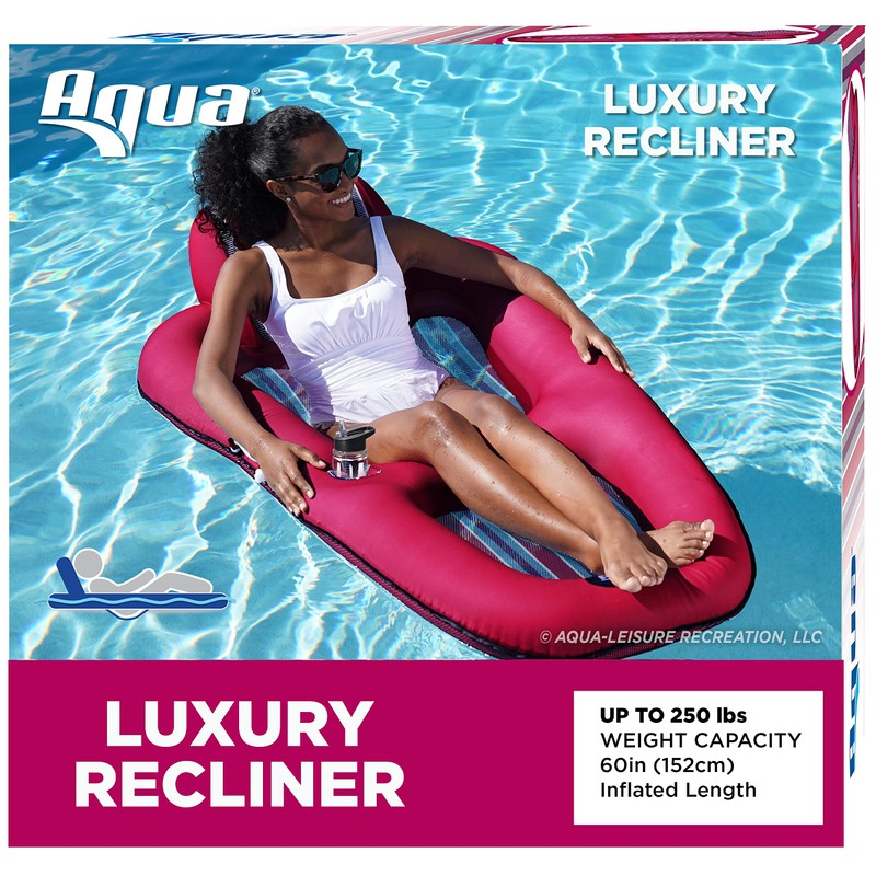 - Luxury pool float: Stay cool in the pool and relax with the comfortable, ergonomic headrest, backrest, and cushioned footrest; navy/burgundy print