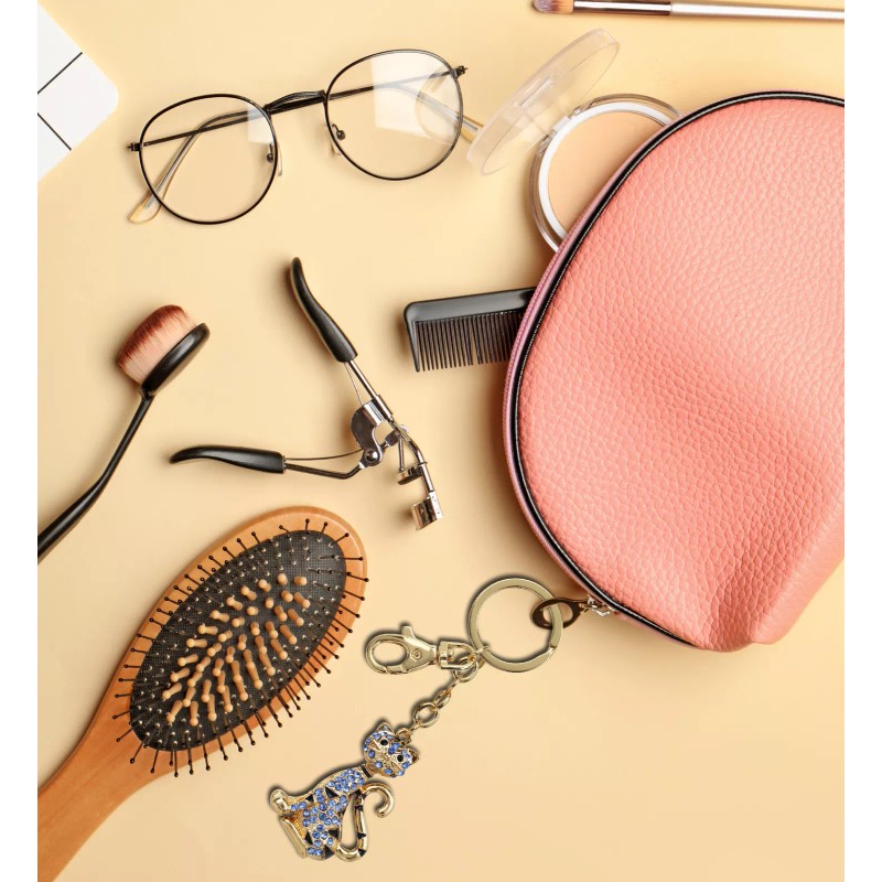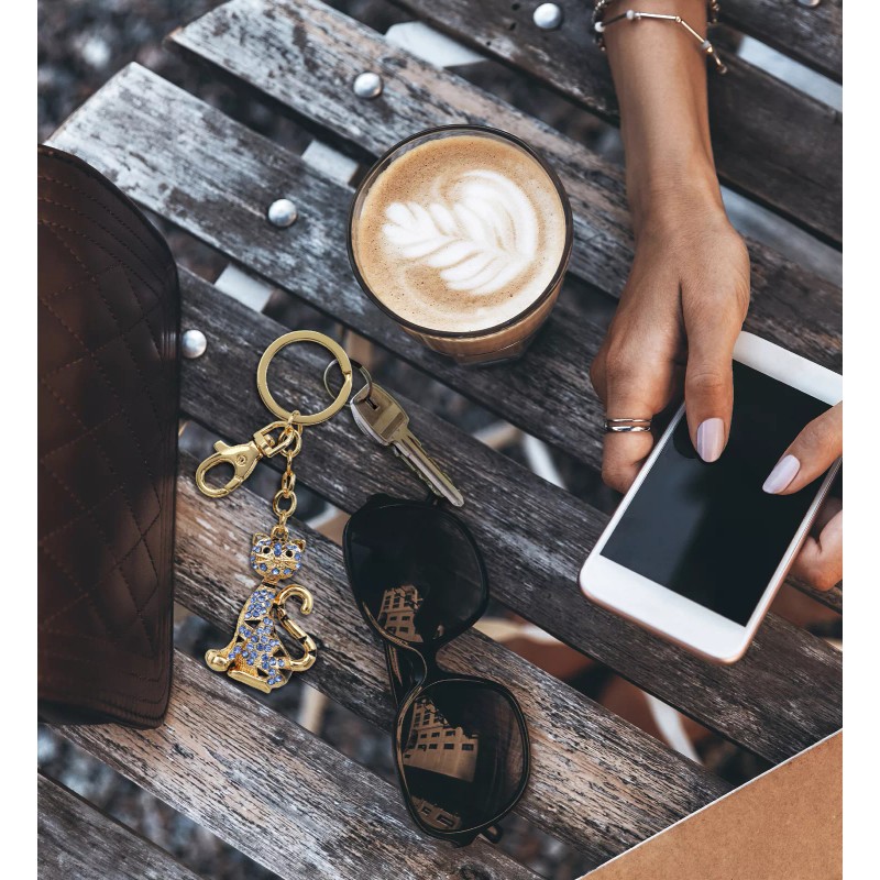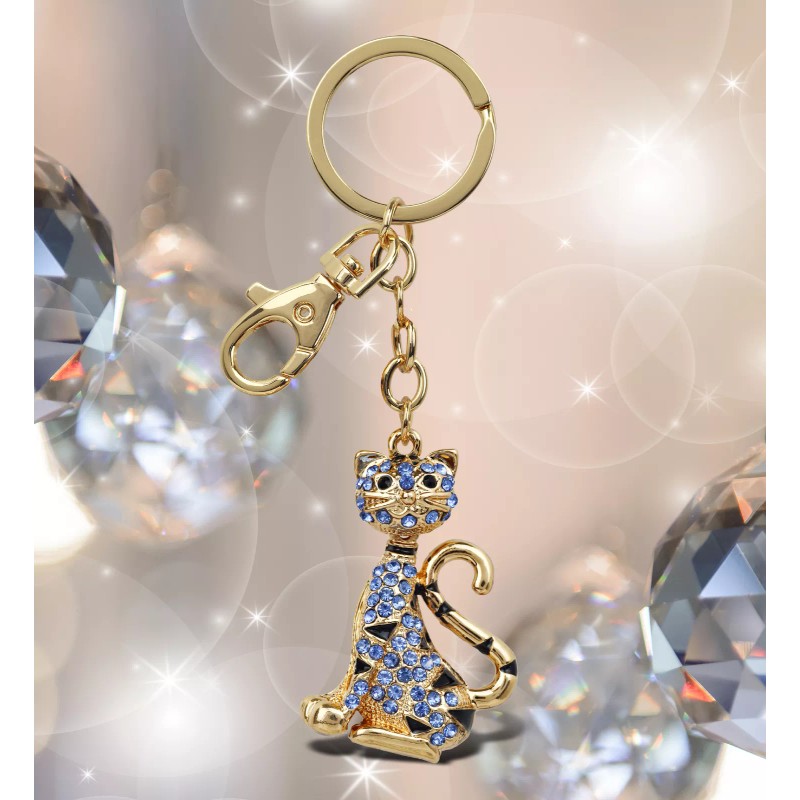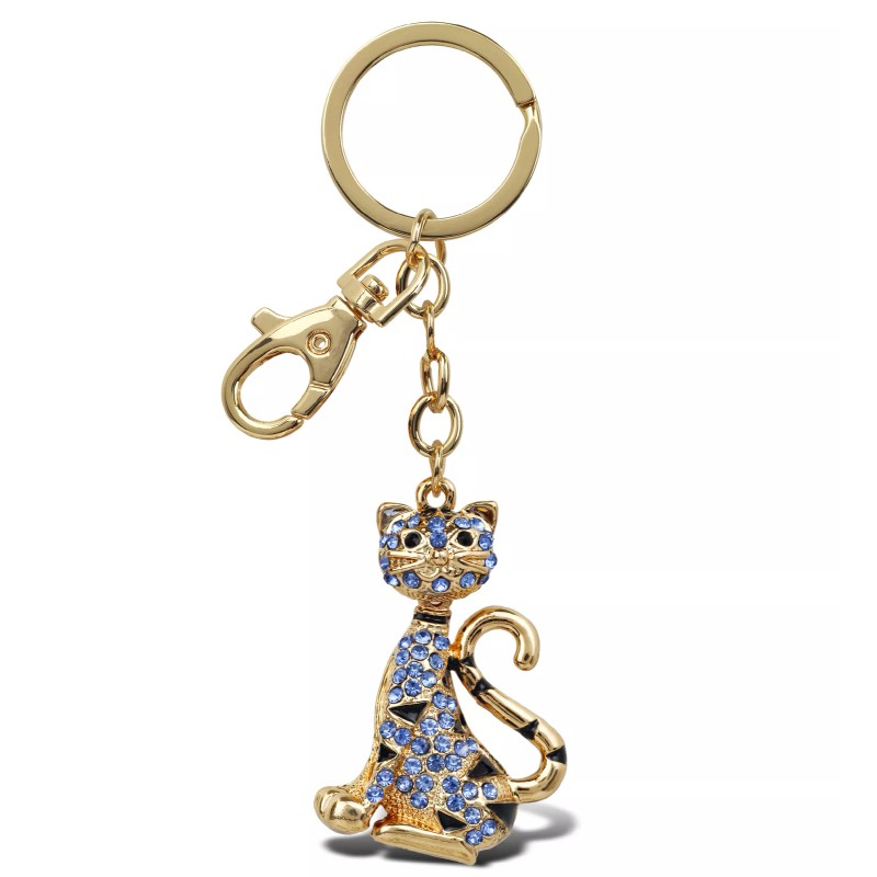 Aqua79 Blue Tiger Cat Keychain - Gold 3D Sparkling Charm Rhinestones with Clasp