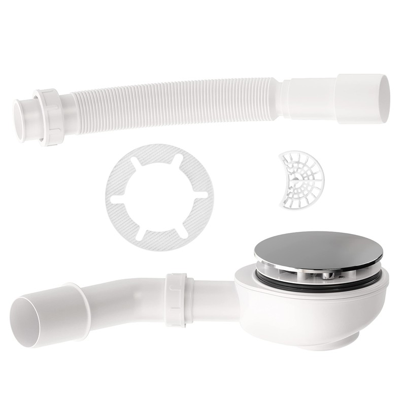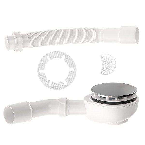 Alcaplast drain set extra flat chrome-plated including drain bend and flex connection for shower trays with a diameter of 90 mm drain hole, cover diameter 116 mm knee - includes pack siphon - self-cleaning construction siphon can be used up to the drain pipe. Direct connection to HT (after thread separation). Material: polypropylene (stable material, greater chemical and thermal resistance). Lid of the siphon. Easy installation for shower wanWith opening diameter 90 mm, opening cover diameter 116 mm