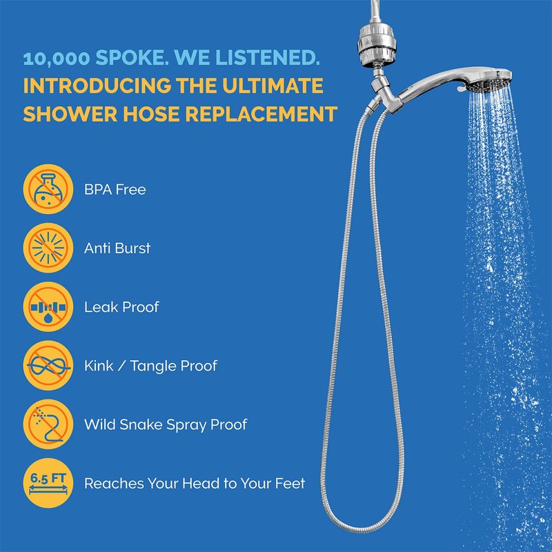 - By You, For You - 10,000 Spoke, We Obliged: Leak Proof, Kink-Proof, Tangle-Proof, Anti-Burst, Rock Solid, and even Extra-Long so your handheld shower heads reach your pets’ feet. We researched every top selling shower hose extension on the market - including ‘the best’ features, while eliminating the hassles, leakage & hangups. Combine with Aquabliss Handheld Shower Head for Superior Shower Filter Results!