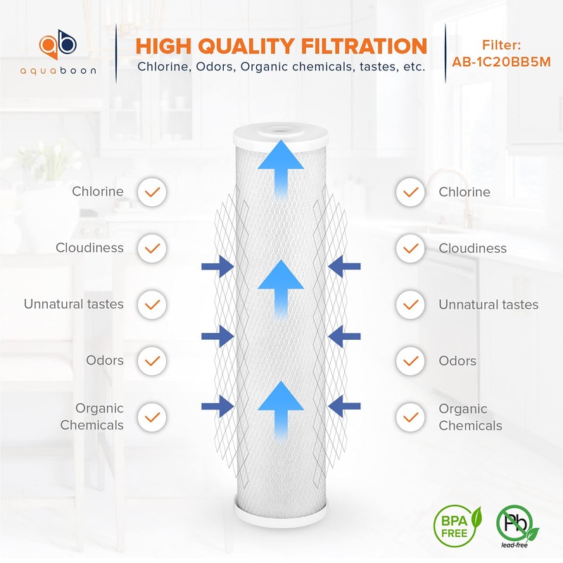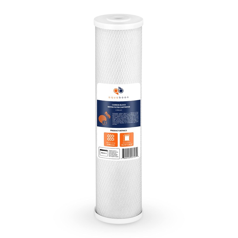 - Unleash the Potential of Our Whole House Activated Carbon Filter Cartridge. Aquaboon 4.5 x 20 carbon block filter is created to capture chlorine and other harmful industrial chemicals, ensuring every drop of water is free from harmful substances. Revel in the unparalleled taste and purity, whether you're hydrating, cooking, bathing, or simply enjoying life's daily moments. Embrace superior water quality with our filter cartridge, enhancing your home water experience.