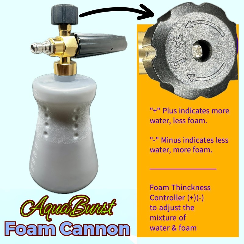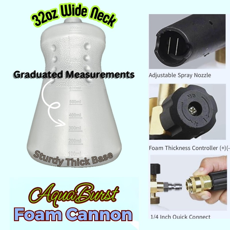 AquaBurst Foam Cannon with 32 oz Wide Base Bottle, Pressure Washer Foam Cannon for Car Wash, Easy to Install with Quick Connect Fitting, 1000-4000 PSI Range, Adjustable Foam and Spray