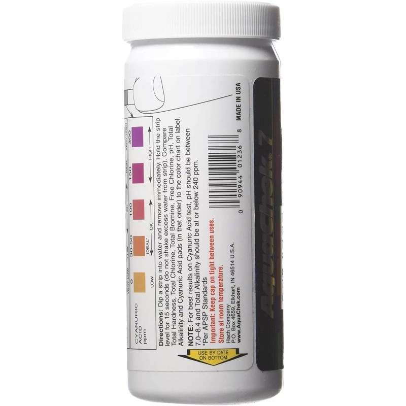 AquaChek Silver 7-Way - 100 Strips Easy, quick, safe and accurate testing of the chemical makeup of your pool. The AquaChek Silver 7-Way Test Strips tests for total hardness, total chlorine, total bromine, free chlorine, pH, total alkalinity, and cyanuric acid (stabilizer).