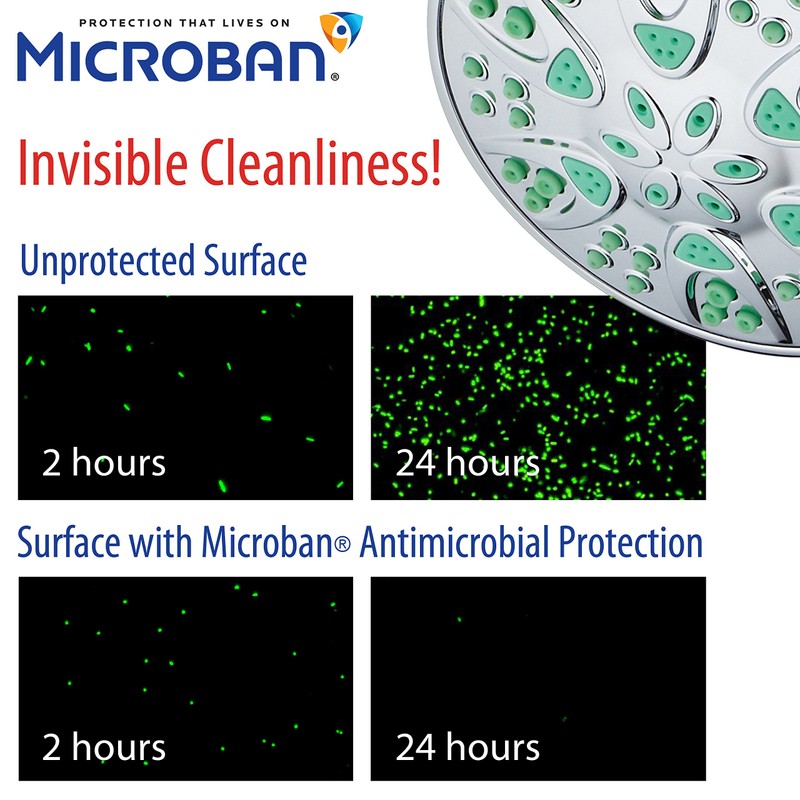 - EASIER TO CLEAN, LONGER PRODUCT LIFE! Hate cleaning your shower head? Microban Antimicrobial Technology keeps shower nozzles cleaner between cleanings. By inhibiting the growth of mold, mildew and bacteria on shower nozzle surfaces, the Invisible Microban Protection helps prevent their degradation over time and extends the life of your shower head