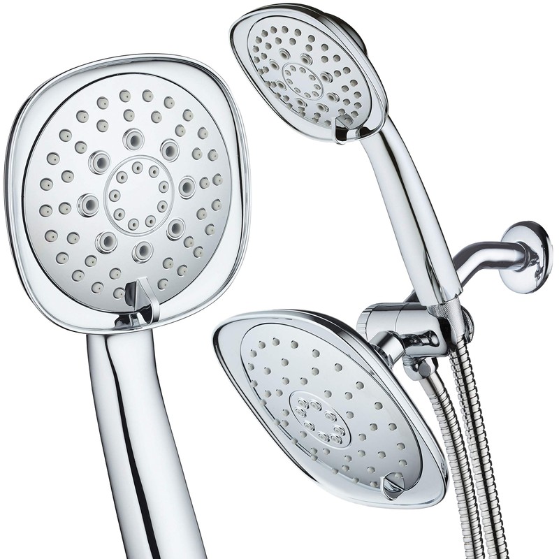 - OVERSIZE CURVED-SURFACE FACE dramatically widens flow trajectory for extra flow coverage. Flexible Anti-clog Nozzles resist calcium buildup to stay clean and clog-free for superior flow performance. Our patented 3-way Water Diverter with Angle-adjustable Overhead Bracket is ideal for hands-free use, while Extra-long 6' Stainless Steel Hose provides longer handheld reach than most other hand showers.
