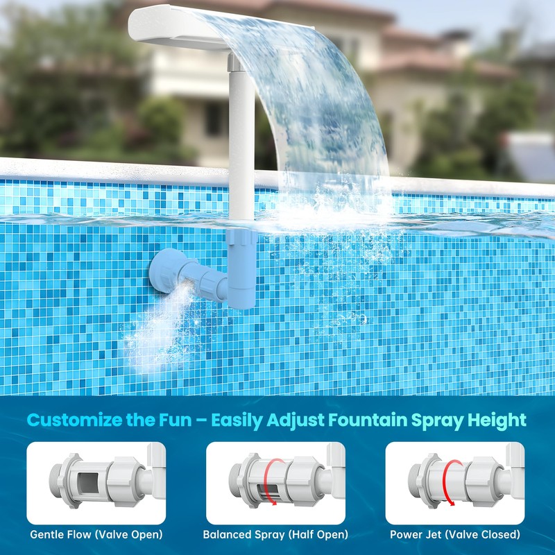 - 💧 Broad, Graceful Waterfall for Stunning Visual Impact Our waterfall delivers a wider, more elegant flow that enhances both the look and sound of your pool, creating a beautiful focal point for in-ground and premium above-ground pools alike.