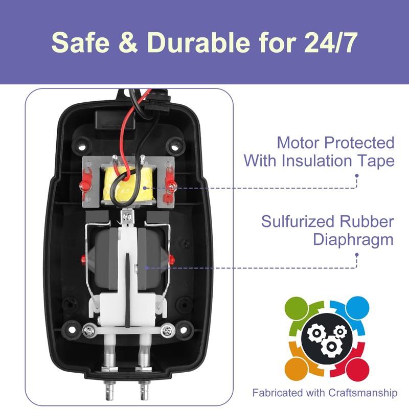 - SAFETY & DURABILITY - The sulfurized diaphragm of this pond bubbler enhances its durability, ensuring long-lasting performance. Additionally, the chrome-plated air outlets are corrosion-resistant, further contributing to the pump's durability and longevity.