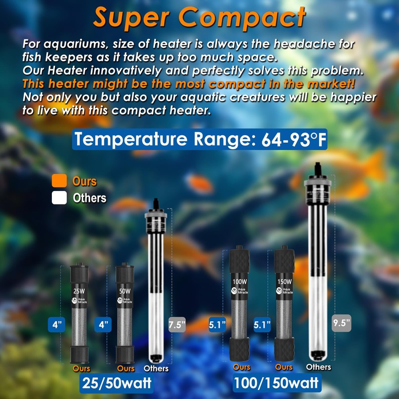 - COMPACT DESIGN - This aquarium heater boasts an exceptionally compact size, likely the smallest available. It's approximately half the length of standard fish heaters, offering a revolutionary solution to the persistent issue of bulky heaters that aquarists often face. Despite its diminutive size, it delivers robust heating capabilities, providing a temperature range of 64F to 93F.