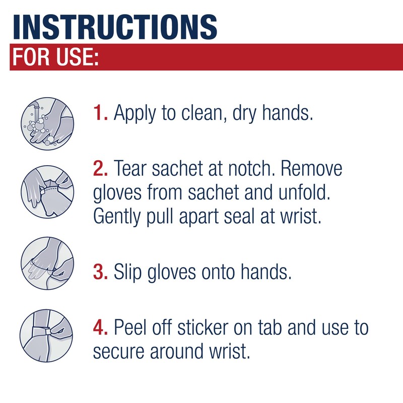 - Application: Apply to clean, dry hands for at least 10 minutes (tear sachet at notch, remove from sachet and unfold, pull apart seal at wrist and slip onto hands)