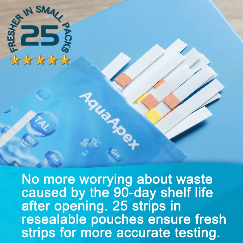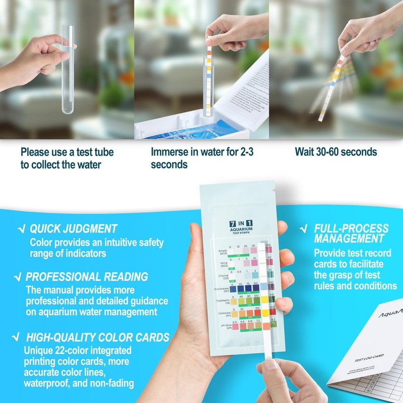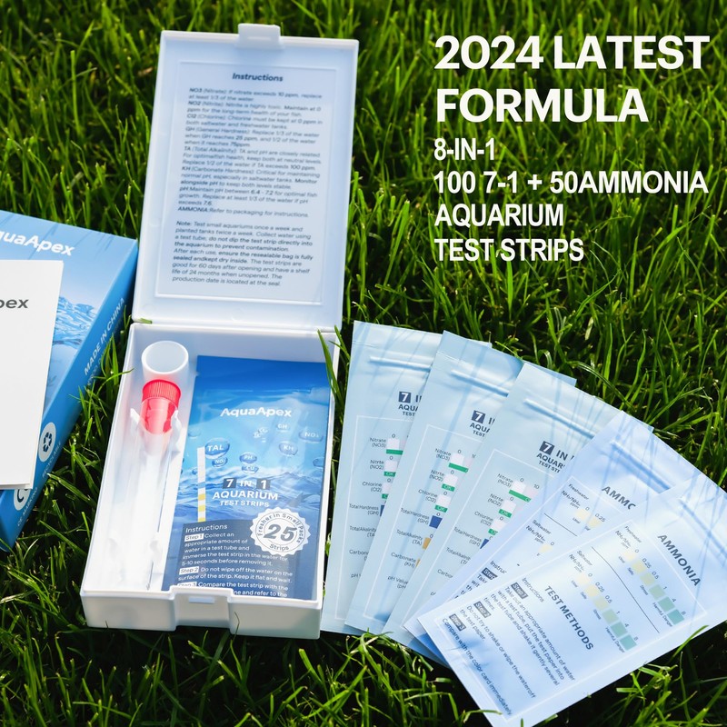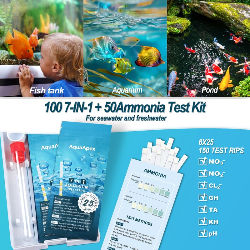 - Ammonia Aquarium Test Kit: This 150-strip 8-in-1 professional test kit includes 50 ammonia test strips and provides testing for nitrate (NO3), nitrite (NO2), chlorine (Cl2), general hardness (GH), alkalinity (TAL), carbonate hardness (KH), pH, and ammonia (NH3). These aquarium water test strips are highly sensitive and can detect early subtle changes in water quality, helping you effectively maintain a safe environment for your aquarium.