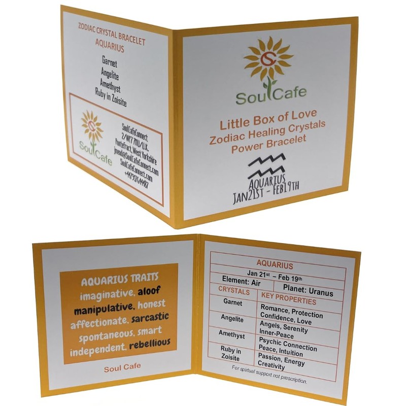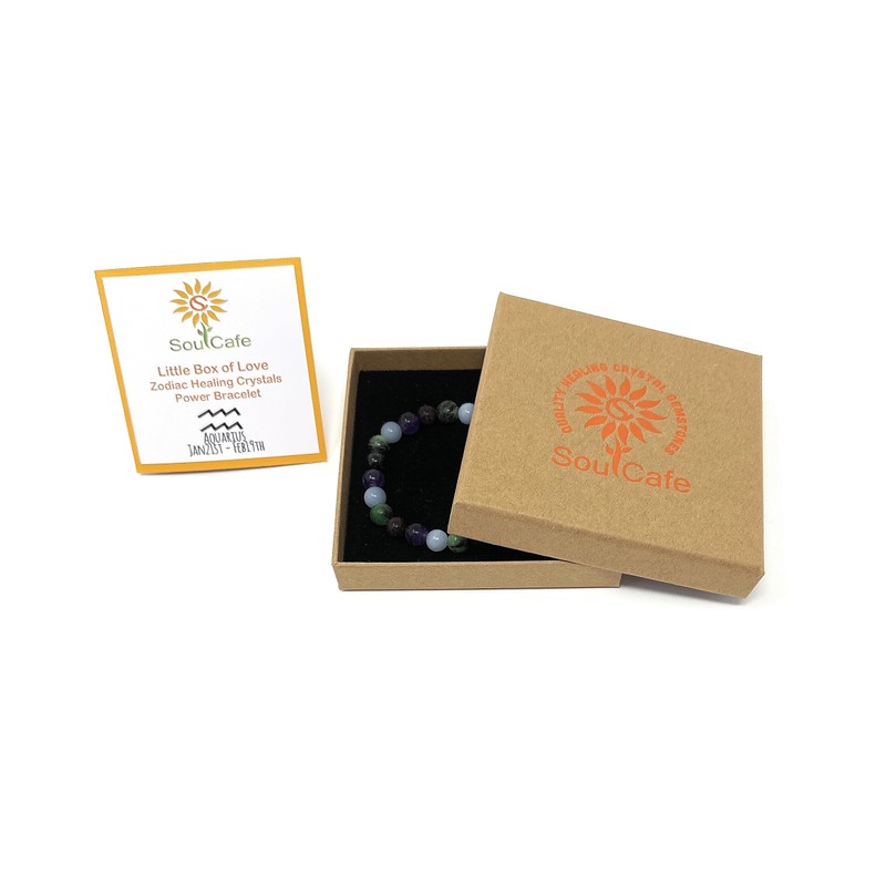The bracelet comes in a beautiful embossed gift box with a Soul Cafe gift tag. The tag contains key information about Aquarius crystals and traits.
