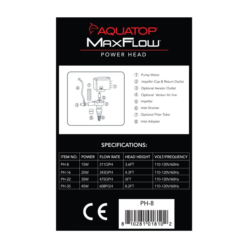 Aquatop’s MaxFlow PH Series power heads run efficiently and quietly while providing superior water movement in aquariums, preventing stagnant water conditions. The optional venturi air intake feature with air regulator allows for increased water aeration. The PH Series is easily fitted to and ideal for powering under gravel filtration systems. Aquatop’s MaxFlow PH Series power heads are great for use in both Freshwater and Saltwater aquariums systems.