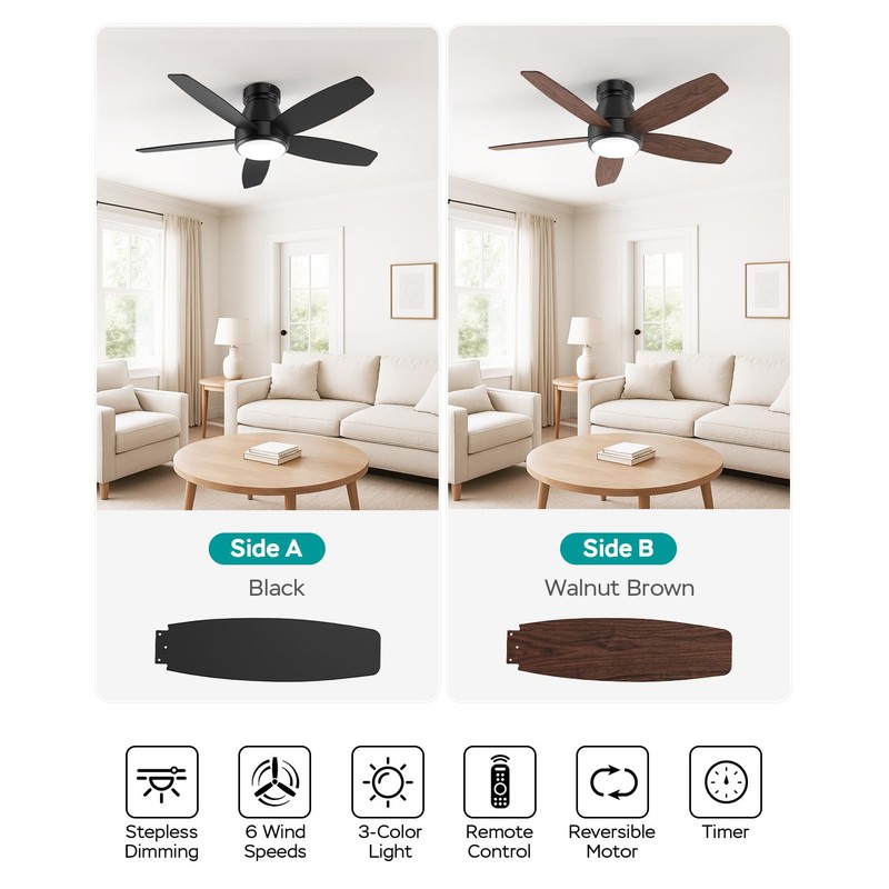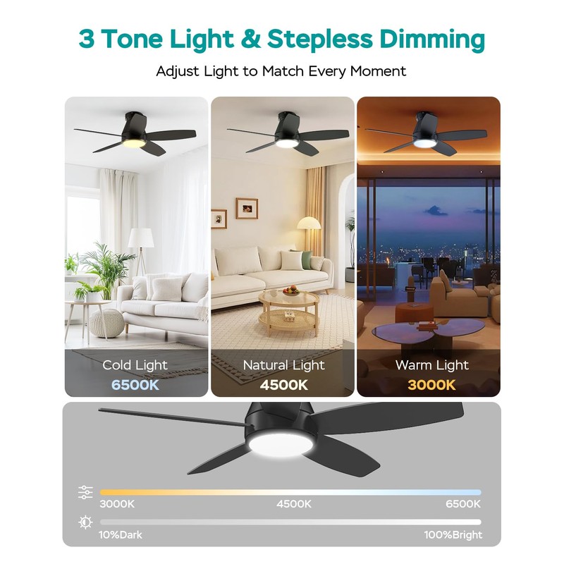 - Stepless Dimming & Three Color Temperatures AdjustmentThis flush mount ceiling fan with lights features stepless dimming and 3000K-6500K color temperature adjustment ,allowing seamless transitions from warm to cool lighting. The low profile ceiling fan with light design ensures quiet operation and optimal airflow while saving space. Perfect for any room, it combines customizable illumination with efficient cooling in one sleek package.