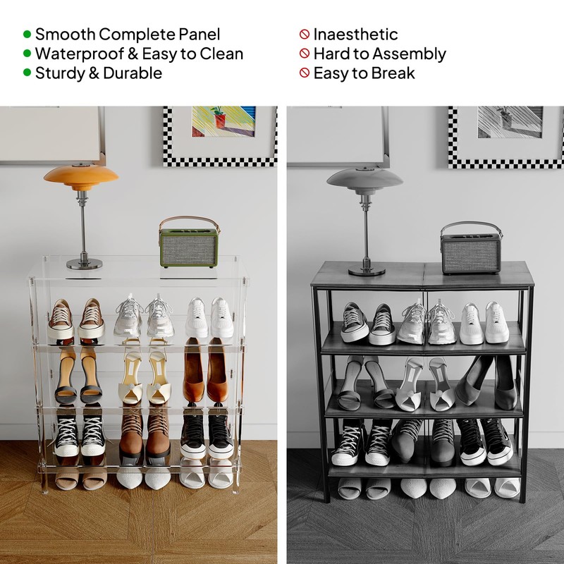 - Superior Quality - Made of clear and smooth acrylic, durable, moisture-proof, and up to 92% transparency, the high-quality material characteristics ensure the shoe rack remains shiny and beautiful for long-term use.