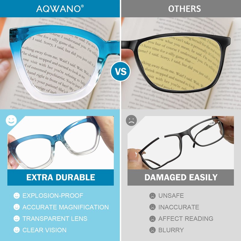 - 【MORE COMPREHENSIVE DEFENSE】- AQWANO reading glasses employs anti-UV base materials combined with coating reflection technology for a dual-defense system, effectively blocking 100% harmful blue light and UV400 rays; blue light readers provide all-day protection, you can enjoy daily wear and better sleep