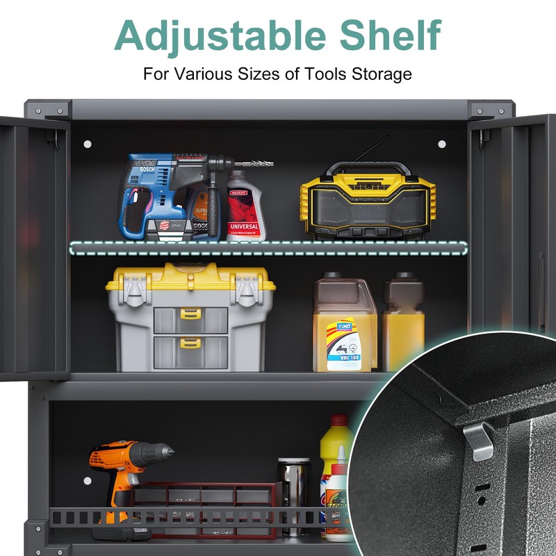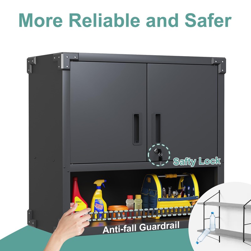 - 【STRONGER LOADING & MORE SECURE】: Due to AQY garage wall cabinets adopt 0.7mm steel plate which is 20% thicker than average standard, robust steel construction can support up to 130 lbs load capacity. Perfect for store various light or heavy duty items. Plus the Metal storage cabinet is built in a locking system comes with 3 keys which effectively protect your precious or private tools and don't have to worry about dirt blowing into your storage cabinet.