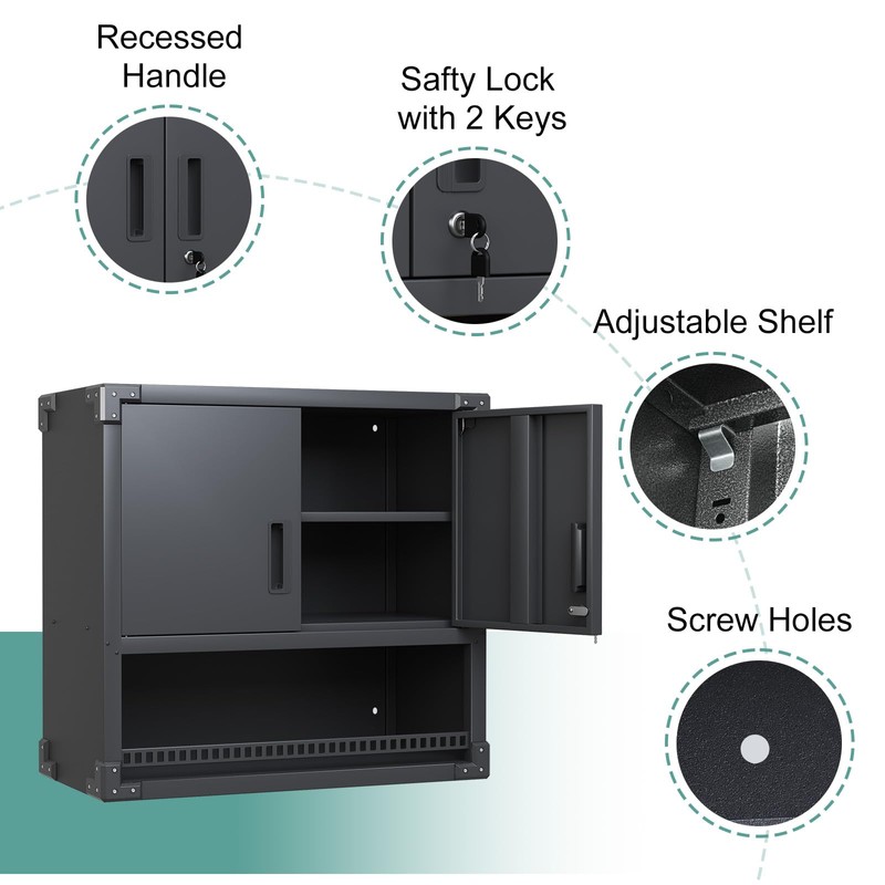 - 【HEAVY-DUTY STURDY】Metal wall cabinets built with powder-coated metal & reinforced construction. This garage wall cabinet has been designed to be hard-wearing and scratch-resistant, the powder-coated surface is easy to clean and looks new even after several years.