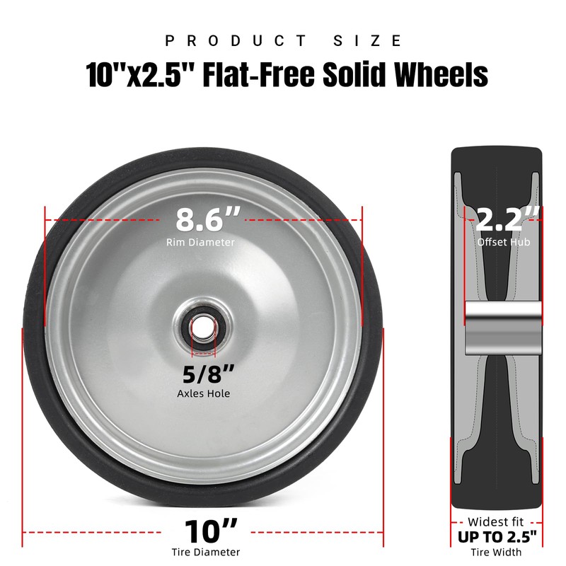 - 10" FLAT FREE SOLID RUBBER REPLACEMENT TIRES - These solid rubber tires will remove the hassle of flat tires so that you can keep going without worries! These solid rubber tire and wheel assembly fit vehicles and equipment with 10-inch tires with 8.6-inch rims (universal 4-inch rims), 5/8-inch axles hole, 2.2" offset hub, and a tire width between 2.2 inches and 2.50 inches. It's a guaranteed fit!