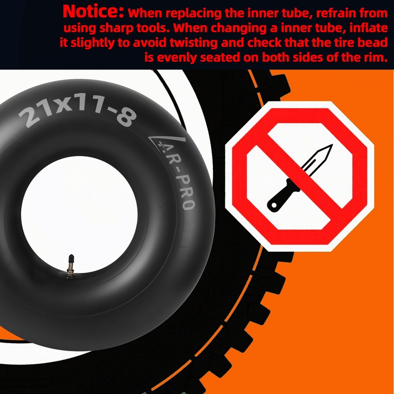 - Heavy-Duty Inner Tube: Durable 21x11x8 butyl rubber inner tube with TR6 metal valve stem, designed for ATVs, lawn mower, tractors, garden trailers, wagons, golf carts, quad bikes, snow blowers and most lawn equipment tires. Ensuring seamless fit and high efficiency in demanding environments.