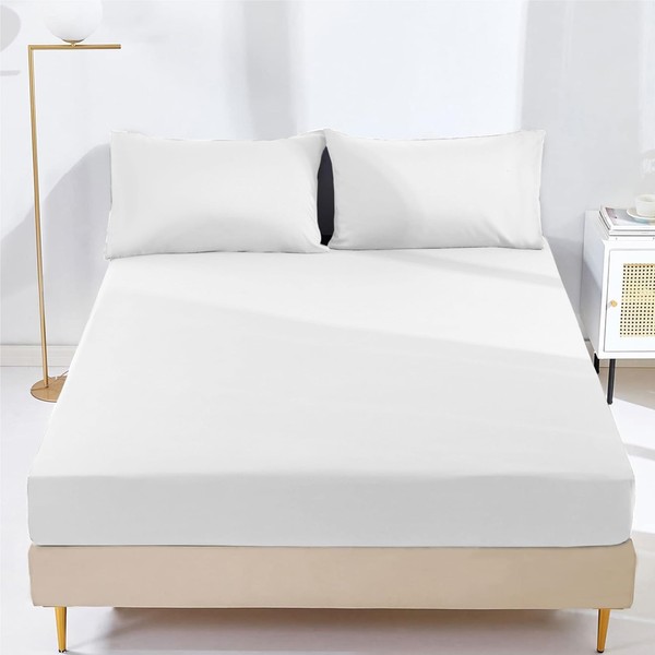 AR Ware Double Fitted Sheet non Iron Wrinkle, 25cm Deep Ultra Soft Microfiber Elastic Fitted Bed Sheets easy care, Fade Resistant (White)