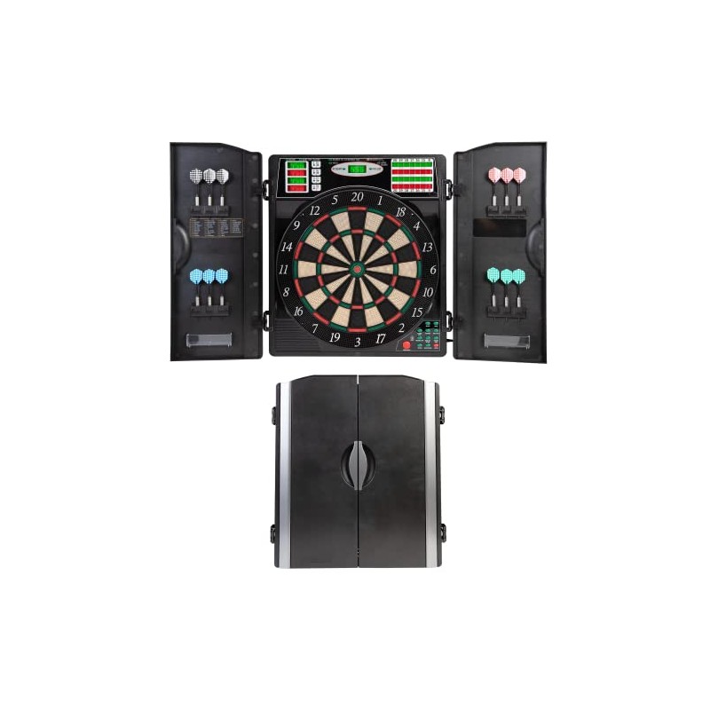 - CONTEMPORARY STYLE – This durable electronic dartboard is mounted in a contemporary-style cabinet.
