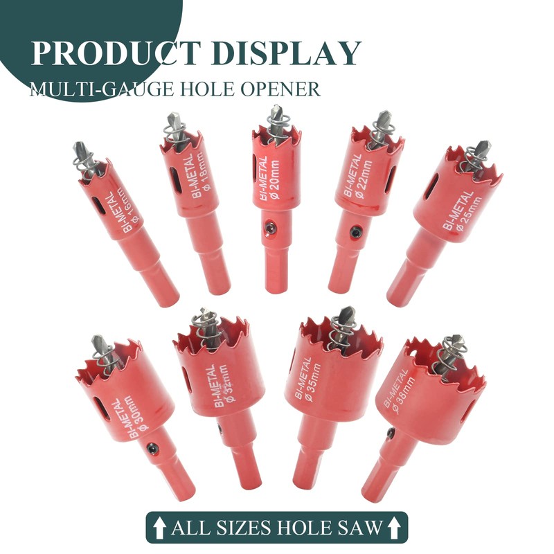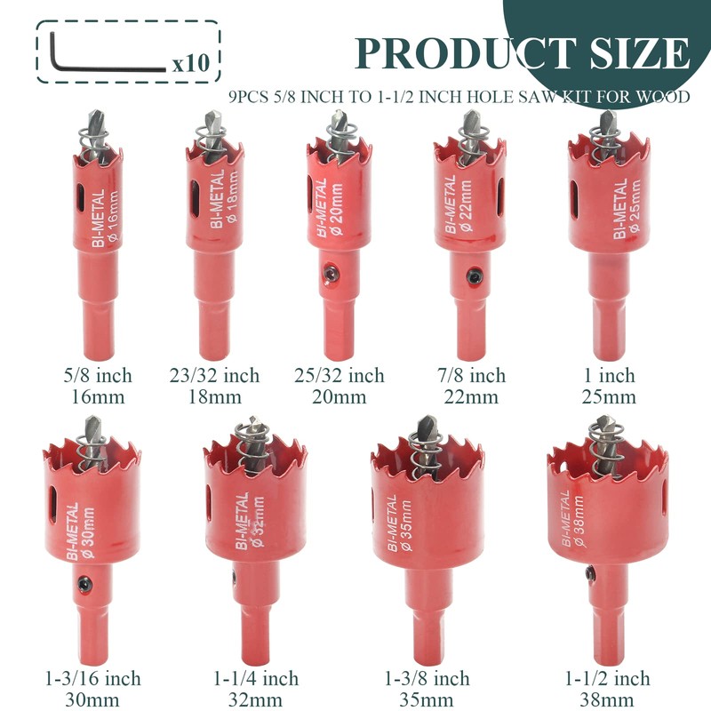 - Package Contains: 9 x Wood Hole Saw Kit, 9 Different Cut Size: 5/8 inch/16mm, 23/32 inch/18mm, 25/32 inch/20mm, 7/8 inch/22mm, 1 inch/25mm, 1-3/16 inch/30mm, 1-1/4 inch/32mm, 1-3/8 inch/35mm, 1-1/2 inch/38mm. The hole saw cutter set can be easily installed on a handheld or vertical drill.