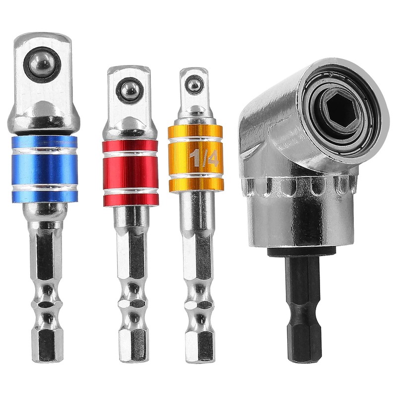 - Package Contains: 3 x Socket Screwdriver Adapter, 1 x 105 Degree Right Angle Drill Adapter. Universal Socket Adapter Set Sizes: 1/4 Inch, 3/8 Inch, 1/2 Inch. 105 Degree Screwdriver Adapter: 1/4 Inch. Hex Shank Diameter: 1/4 Inch / 6.35mm. Color: Silver.