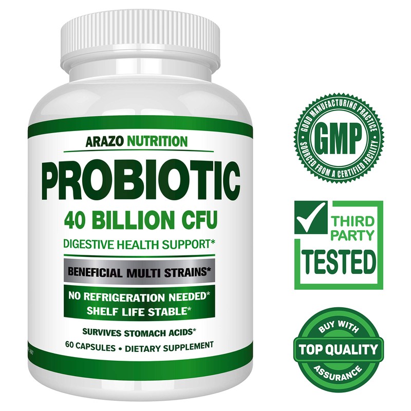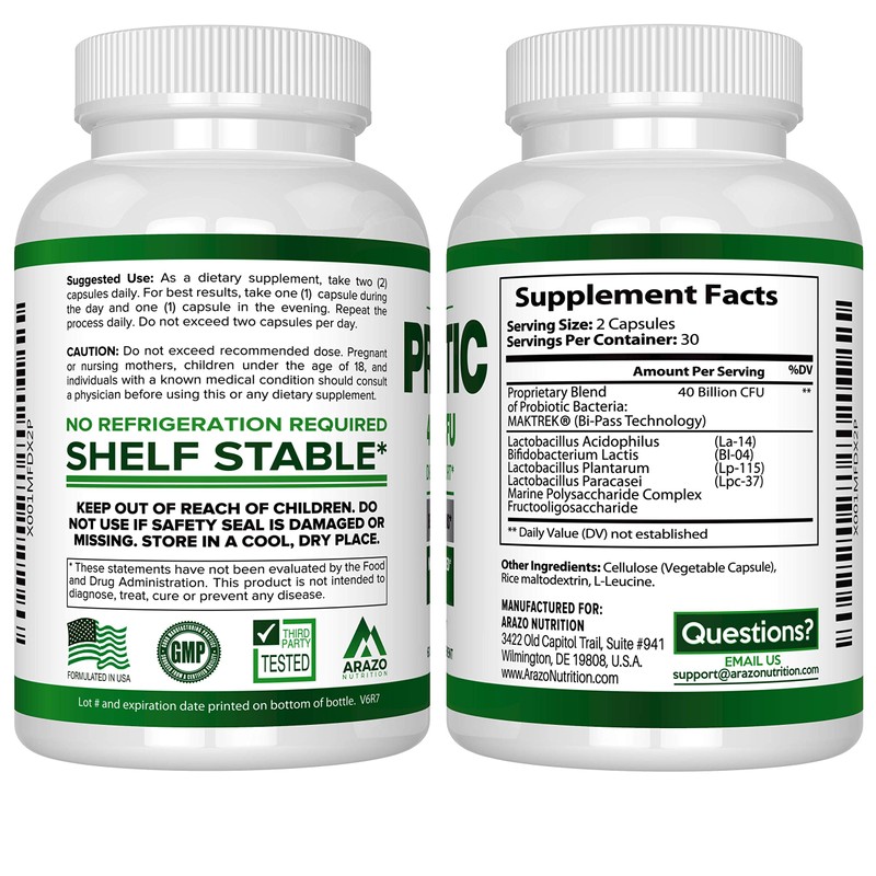 Arazo Nutrition Probiotic 40 Billion CFU - Shelf Stable with Prebiotics and Acidophilus - Stable Potency Until Expiration – Time Delay Release Probiotics